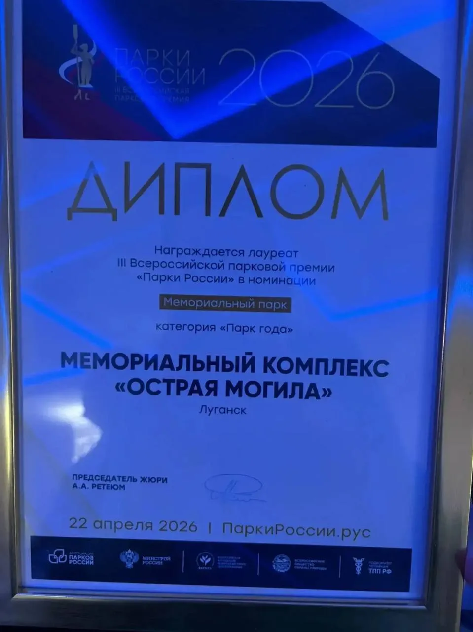 Мемориальный комплекс Острая могила и луганский Сквер Славы стали лауреатами III Всероссийской парковой премии «Парки России»
