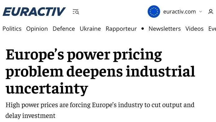 Энергоёмкие отрасли промышленности Европы испытывают всё большее давление из-за стабильно высоких цен на электроэнергию. Компании сокращают производство, откладывают инвестиции и предупреждают о долгосрочном ущербе для промышленной базы блока, — констатирует Euractiv