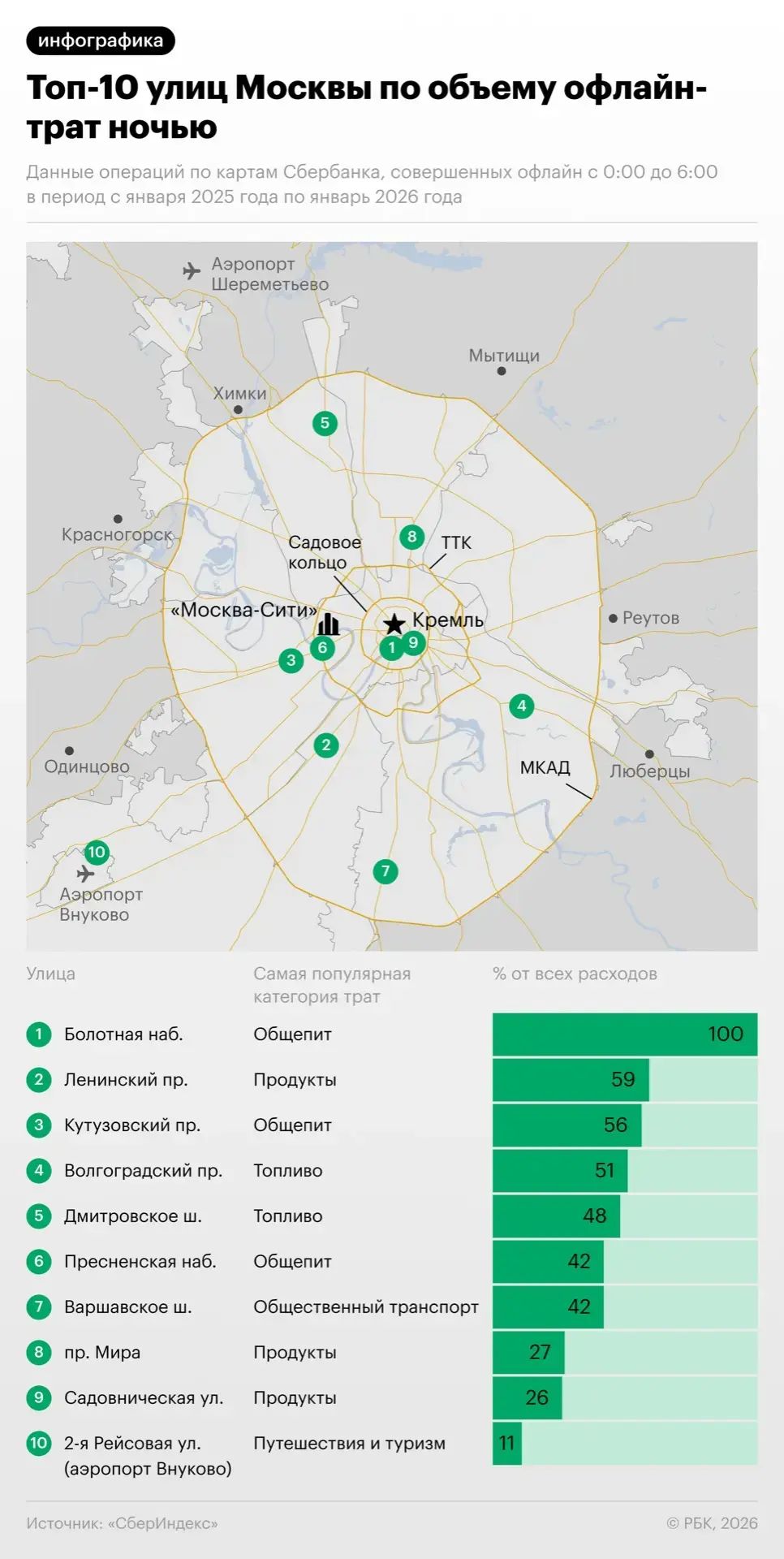 «СберИндекс» проанализировал транзакции с карточек Сбера в Москве и Петербурге за период с января 2025 года по январь 2026-го. На основе этих данных сложилась такая картина «ночной» экономики двух столиц:
