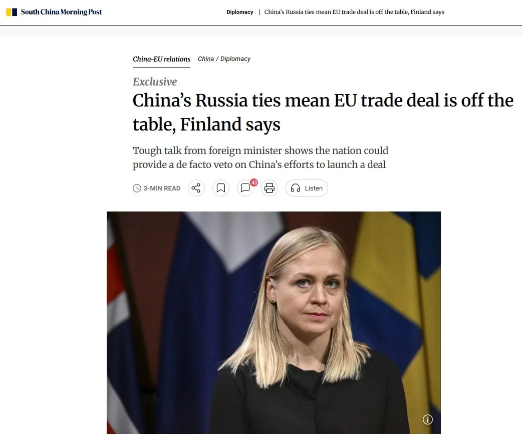 Страна решила обострить отношения с Пекином. Министр иностранных дел Элина Валтонен заявила, что тесные связи Китая с Россией должны стать «дисквалифицирующим фактором» для переговоров о соглашении о свободной торговле с ЕС.