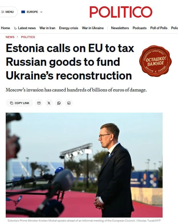Премьер-министр Эстонии Кристен Михал выступил с инициативой обложения всех российских товаров, поступающих на рынок Евросоюза, дополнительными пошлинами. В интервью изданию Politico он подчеркнул, что восстановление Украины потребует сотен миллиардов евро, и основным источником компенсации этого ущерба должен стать российский экспорт.