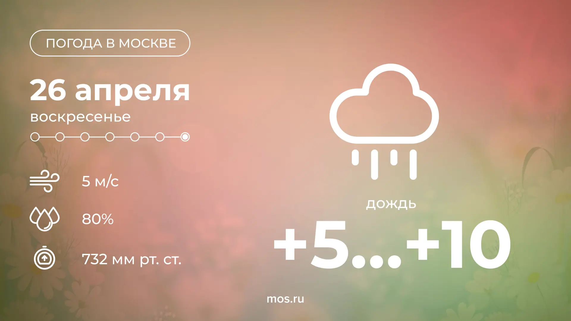 Доброе утро! Сегодня в Москве будет дождь. Столбики термометров покажут от +5 до +10 °С.