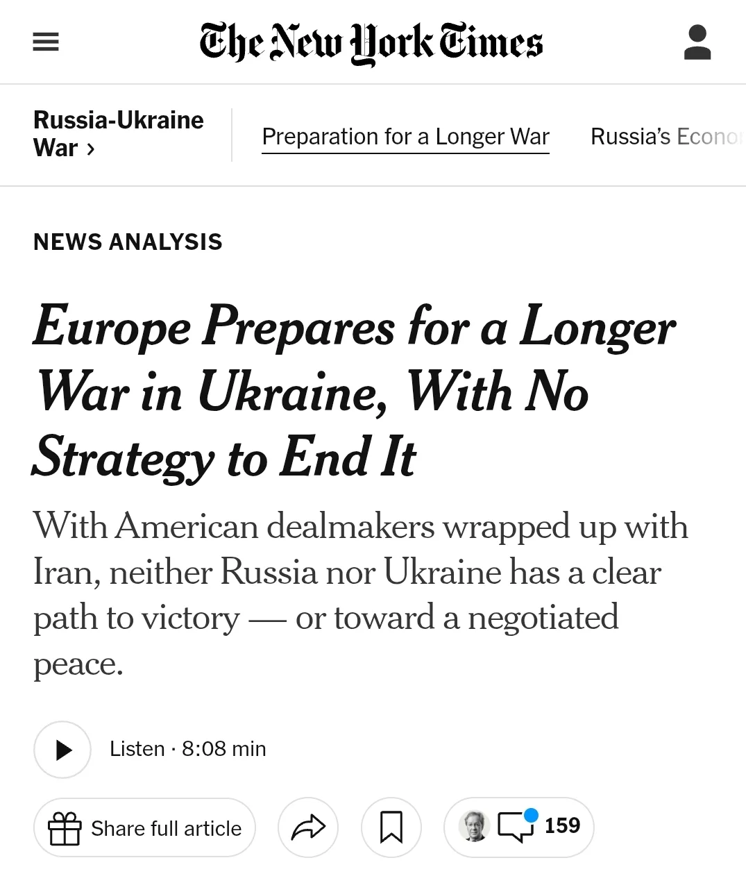 Европа не знает, как закончить войну на Украине, и готовится к ее затягиванию, сообщает американская газета The New York Times.