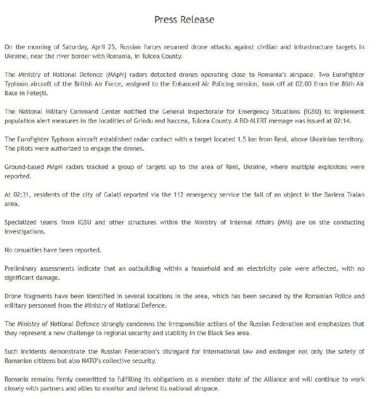 Министерство обороны Румынии официально подтвердило: впервые с начала специальной военной операции истребитель ВВС Великобритании Eurofighter Typhoon FGR4 уничтожил российские беспилотники над украинской территорией. Удар был нанесён из воздушного пространства Румынии через госграницу.