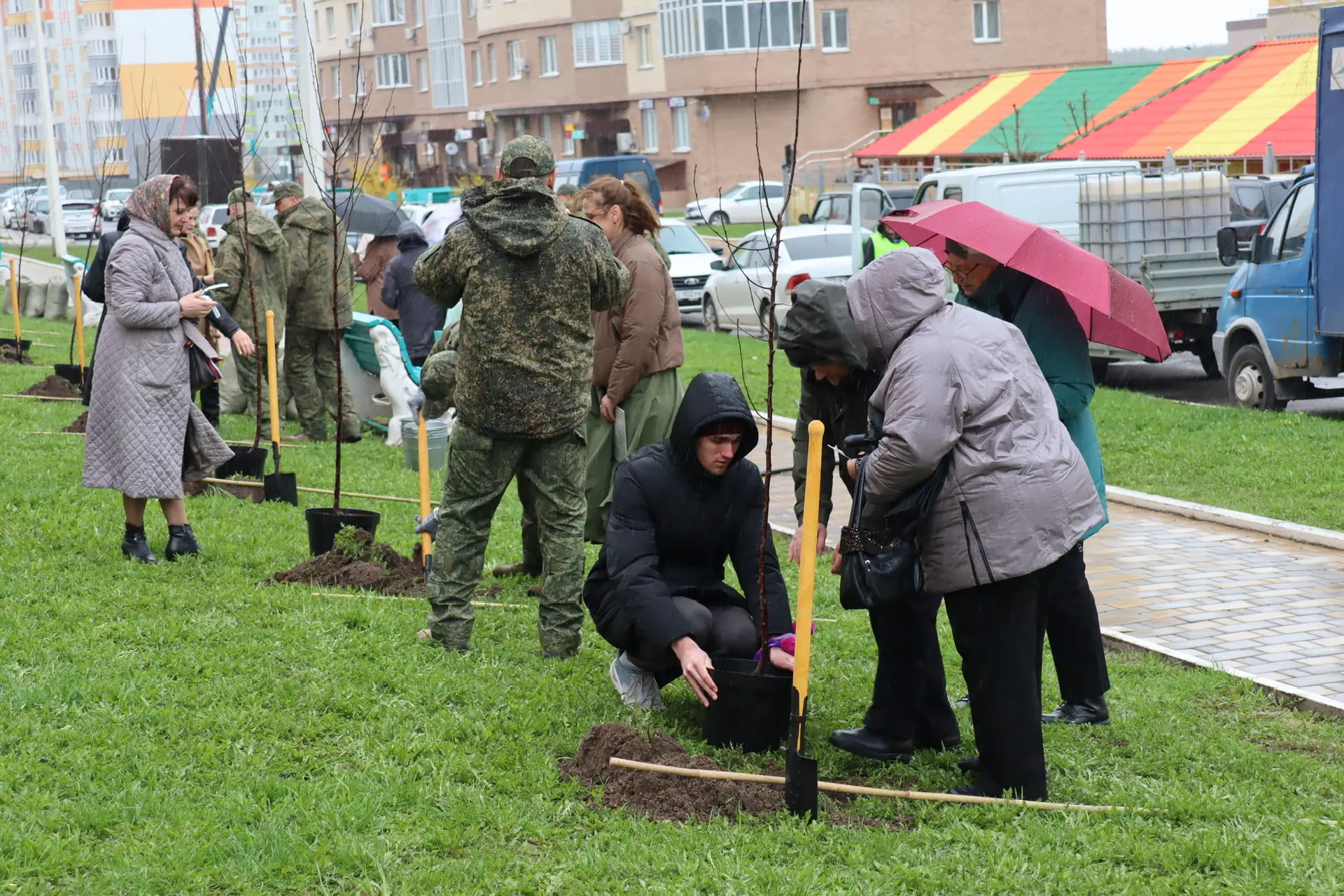 Высадка аллеи памяти на проспекте Дериглазова. На многих яблоневых саженцах жители сами вешали таблички с названием своих родных городов и сёл, которые они временно оставили.