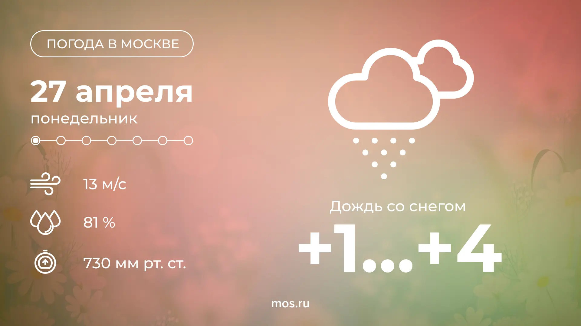 Доброе утро! Сегодня в Москве будет дождь со снегом. Столбики термометров покажут от +1 до +4 °С. Одевайтесь теплее.