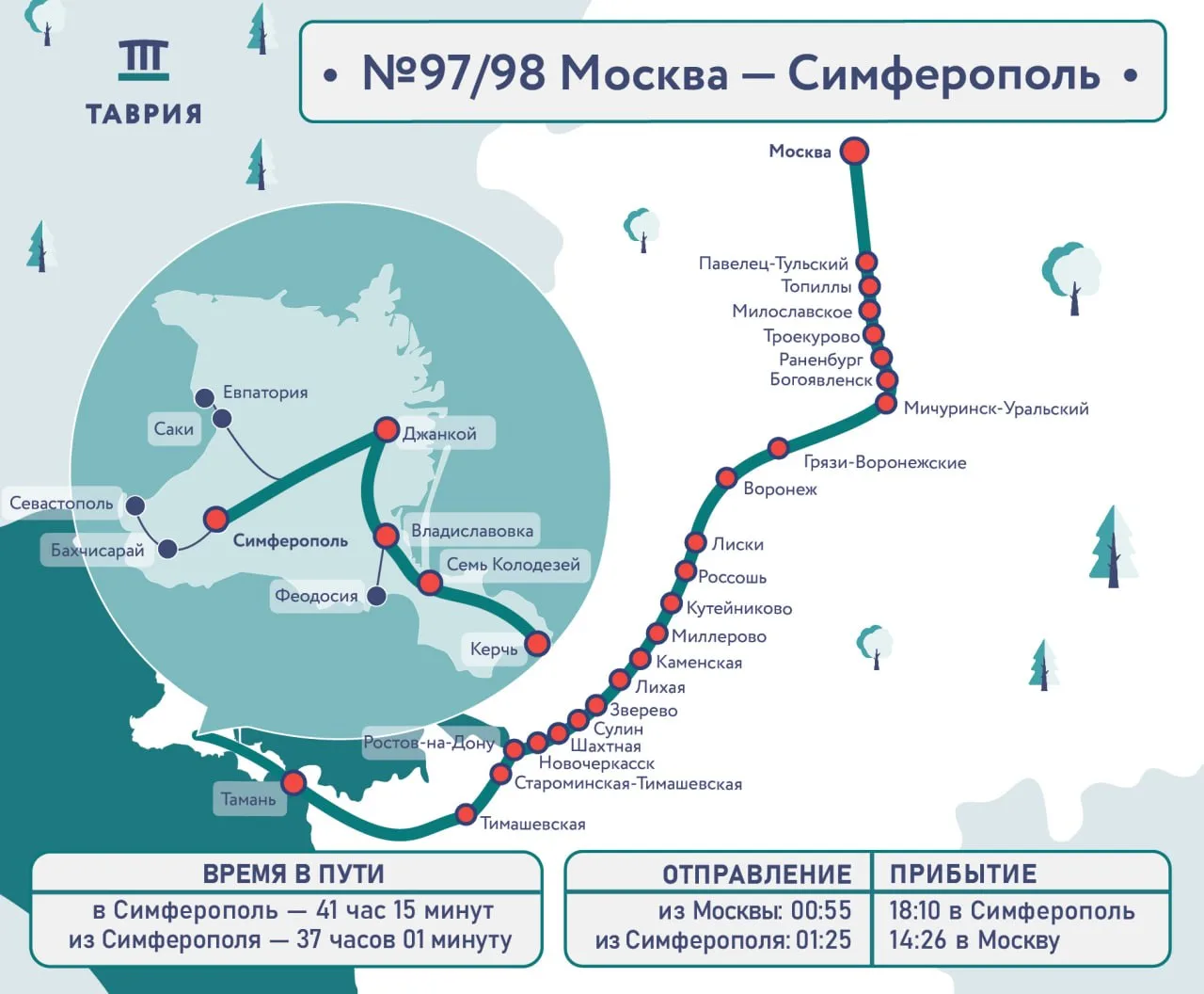 Он следует через Воронеж, Ростов-на-Дону, Тамань. В Крыму делает остановки в Керчи, Семи Колодезях, Владиславовке, Джанкое.