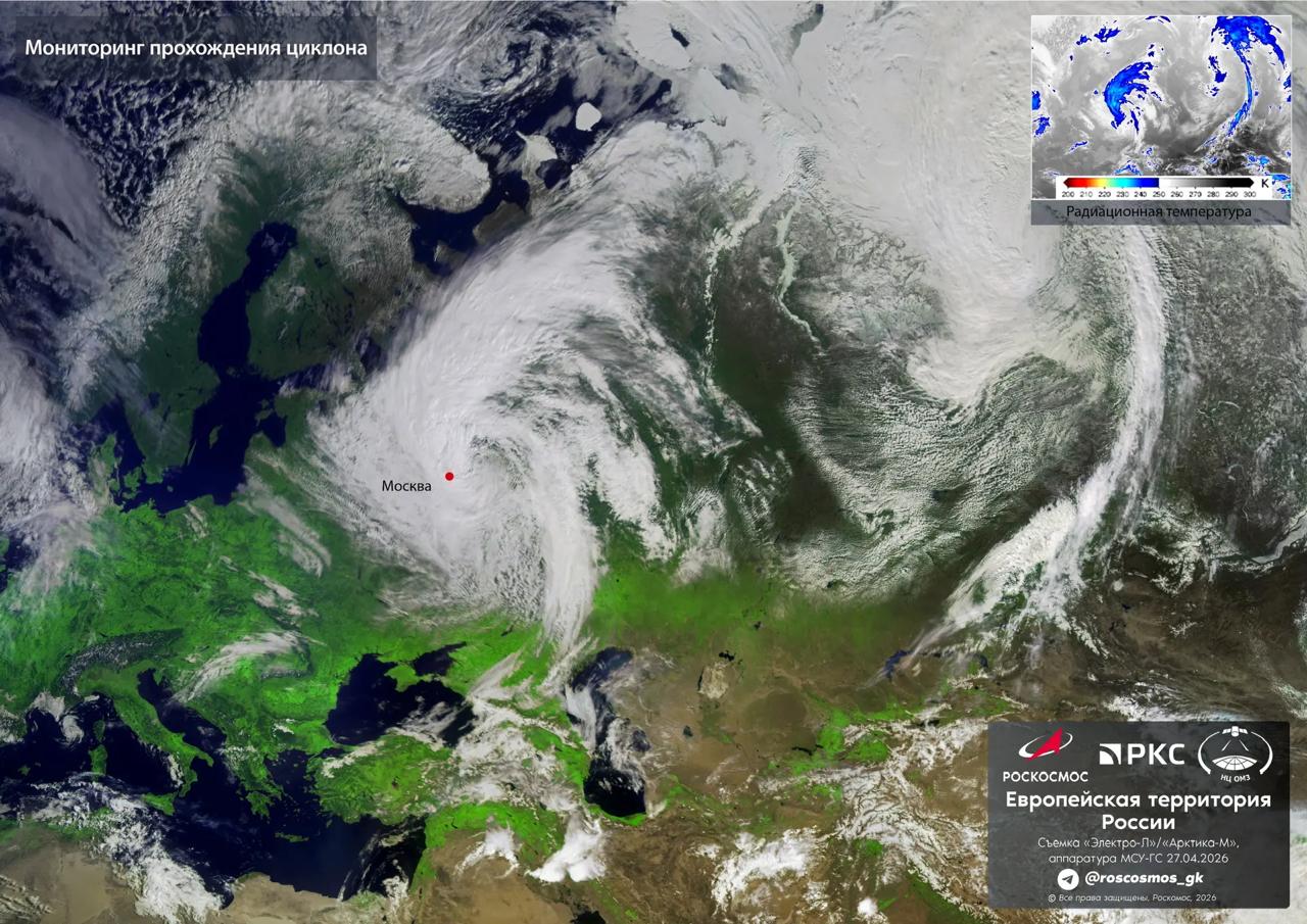 Так выглядит со спутника циклон, который принес снег в Москву и другие регионы России.