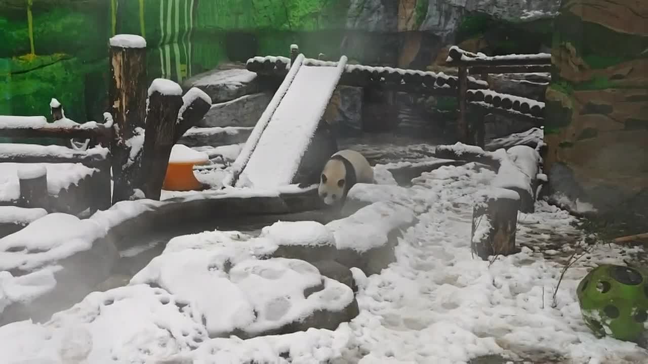 Панда Катюша из Московского зоопарка радуется внезапной зиме в конце апреля.