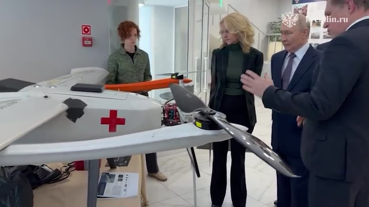 На выставке в Федеральном центре медицины катастроф в Москве Владимир Путин осмотрел российский беспилотник «Аист», который применяется для транспортировки медицинских грузов и организации телемедицинских консультаций.