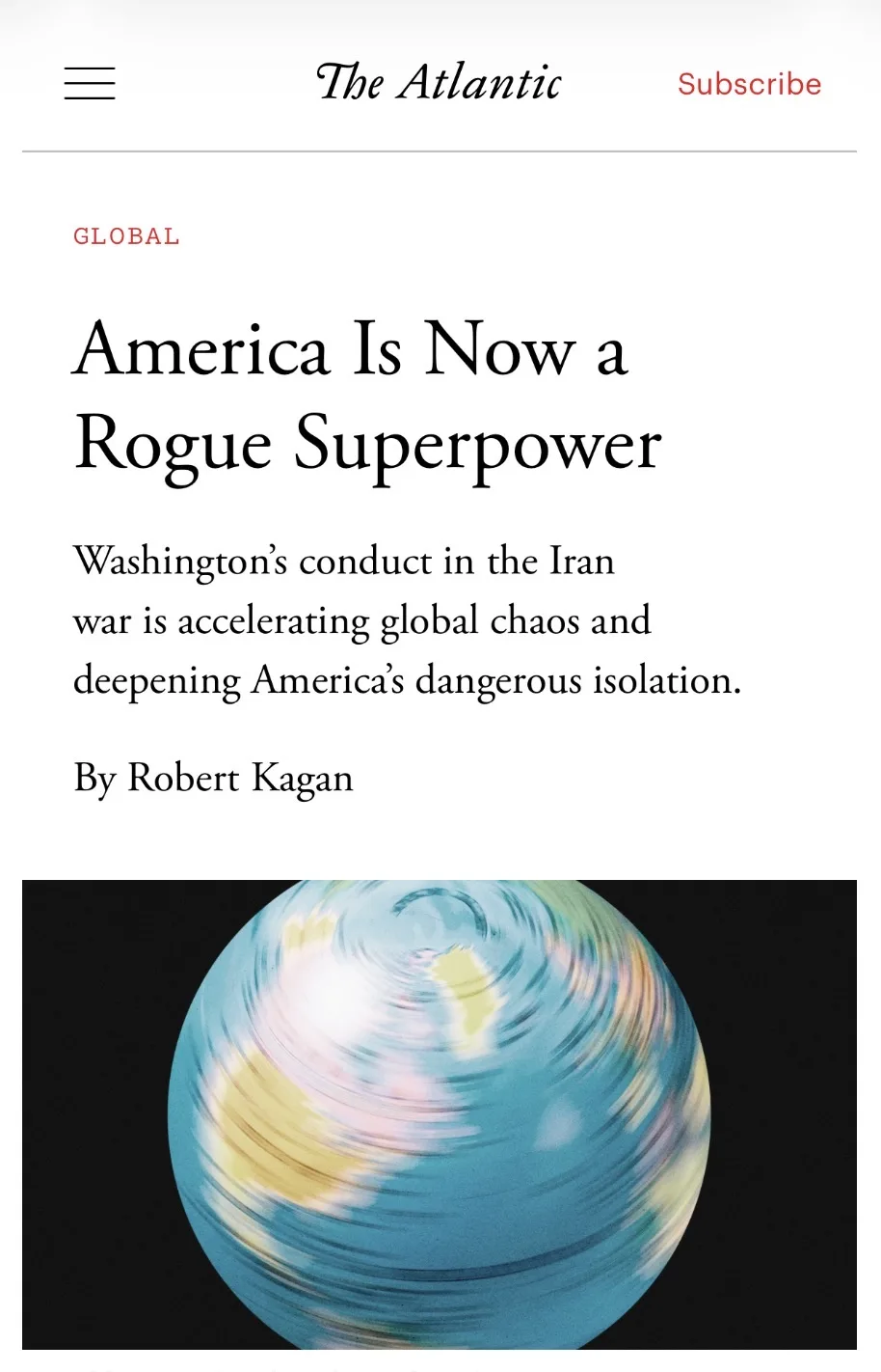 В статье для издания историк Роберт Каган отмечает, что Вашингтон стремительно теряет влияние в многополярном мире, фактически превращаясь в «державу-изгоя». После агрессии против Ирана союзники начали отворачиваться от Белого дома, а европейские сателлиты остаются без привычного «зонтика безопасности», осознавая тщетность американских гарантий, причитает автор.