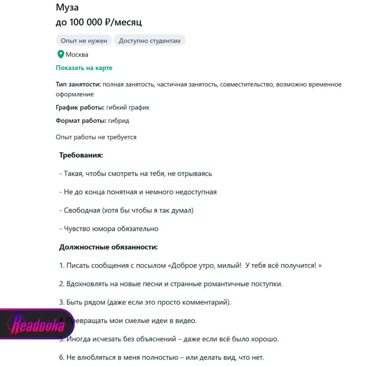 Необычная вакансия появилась в Москве: музыкант готов платить музе 100 тыс в месяц. За такую зарплату нужно будет писать сообщения «доброе утро, милый», вдохновлять, иногда исчезать без объяснений, строго не влюбляться, быть немного недоступной и свободной — хотя бы, чтобы так думал сам музыкант. Вместо премии соискательницу ждут цветы и походы в кафе.