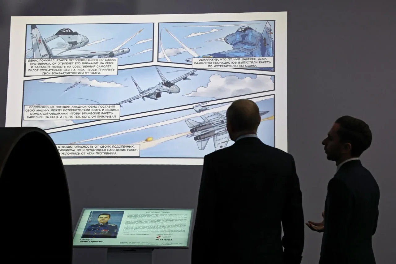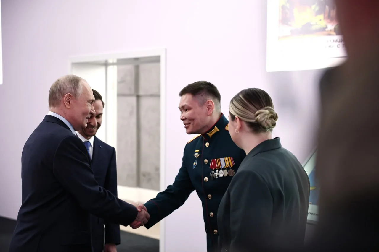Перед началом встречи с представителями коренных малочисленных народов Президент осмотрел мультимедийную интерактивную выставку «Знание.Герои», посвящённую участникам и ветеранам специальной военной операции