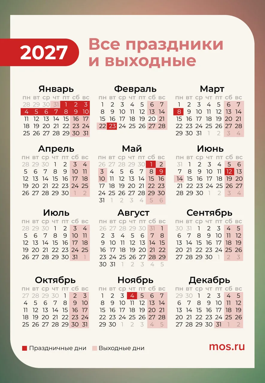 В конце апреля уже думаем, как будем отдыхать в следующем году. Сохраняйте календарь на 2027-й и отправляйте друзьям и коллегам.