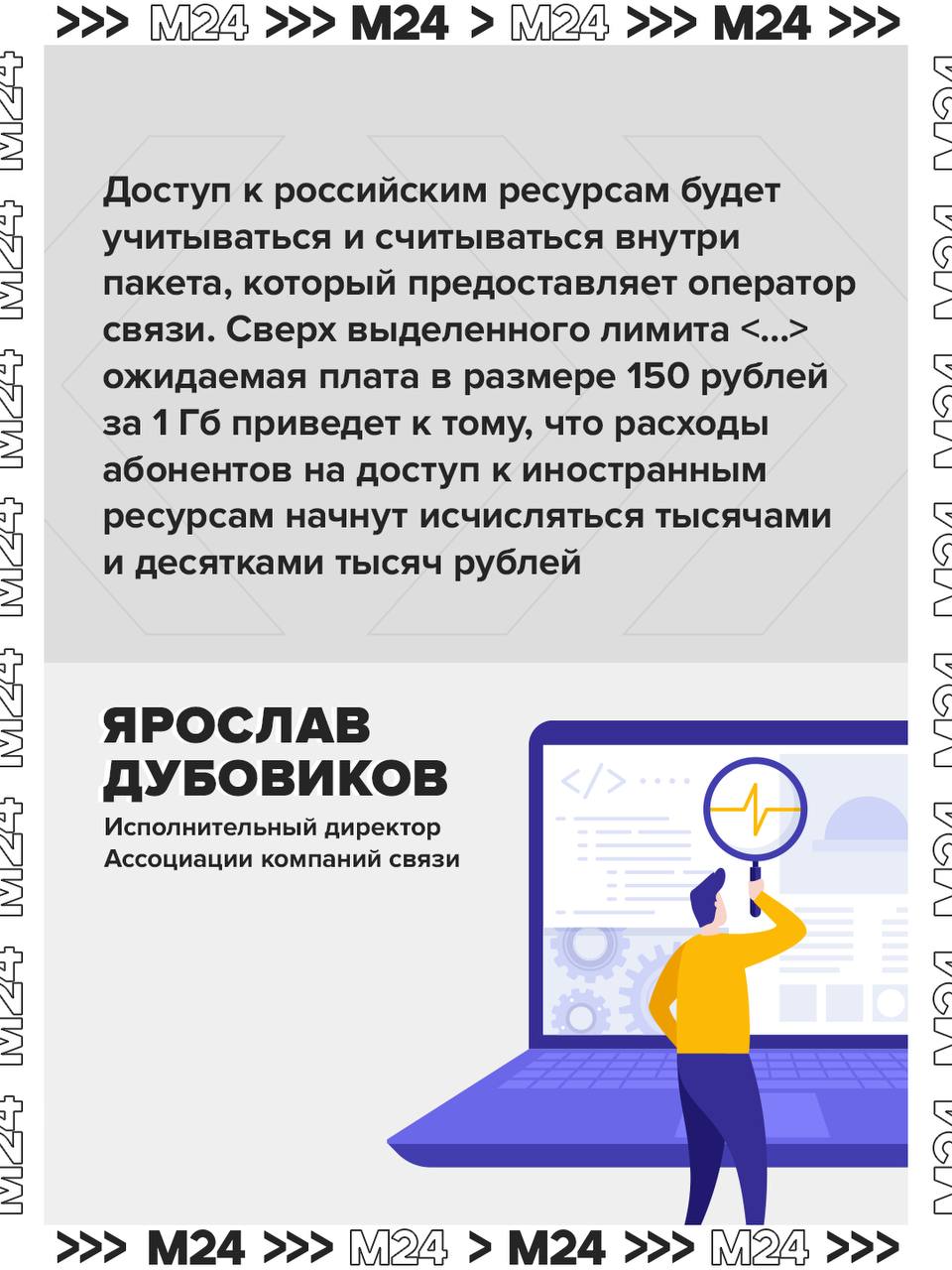 «Доступ к российским ресурсам будет учитываться и считываться внутри пакета, который предоставляет оператор связи. Сверх выделенного лимита <...> ожидаемая плата в размере 150 рублей за 1 Гб приведет к тому, что расходы абонентов на доступ к иностранным ресурсам начнут исчисляться тысячами и десятками тысяч рублей», — считает исполнительный директор Ассоциации компаний связи Ярослав Дубовиков.