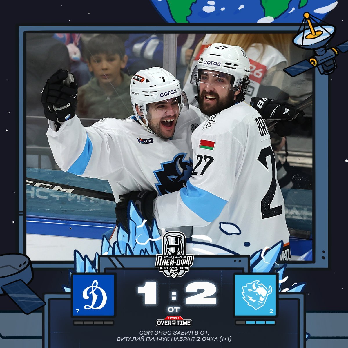 Минское «Динамо» в гостяз обыграло московское «Динамо» со счетом 2:1 в овертайме в третьем матче первого раунда плей-офф КХЛ.